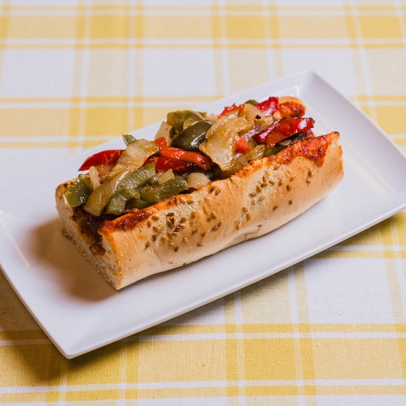 Uncle Vince’s Sausage, Roasted Peppers and Onions Toasted in our Oven